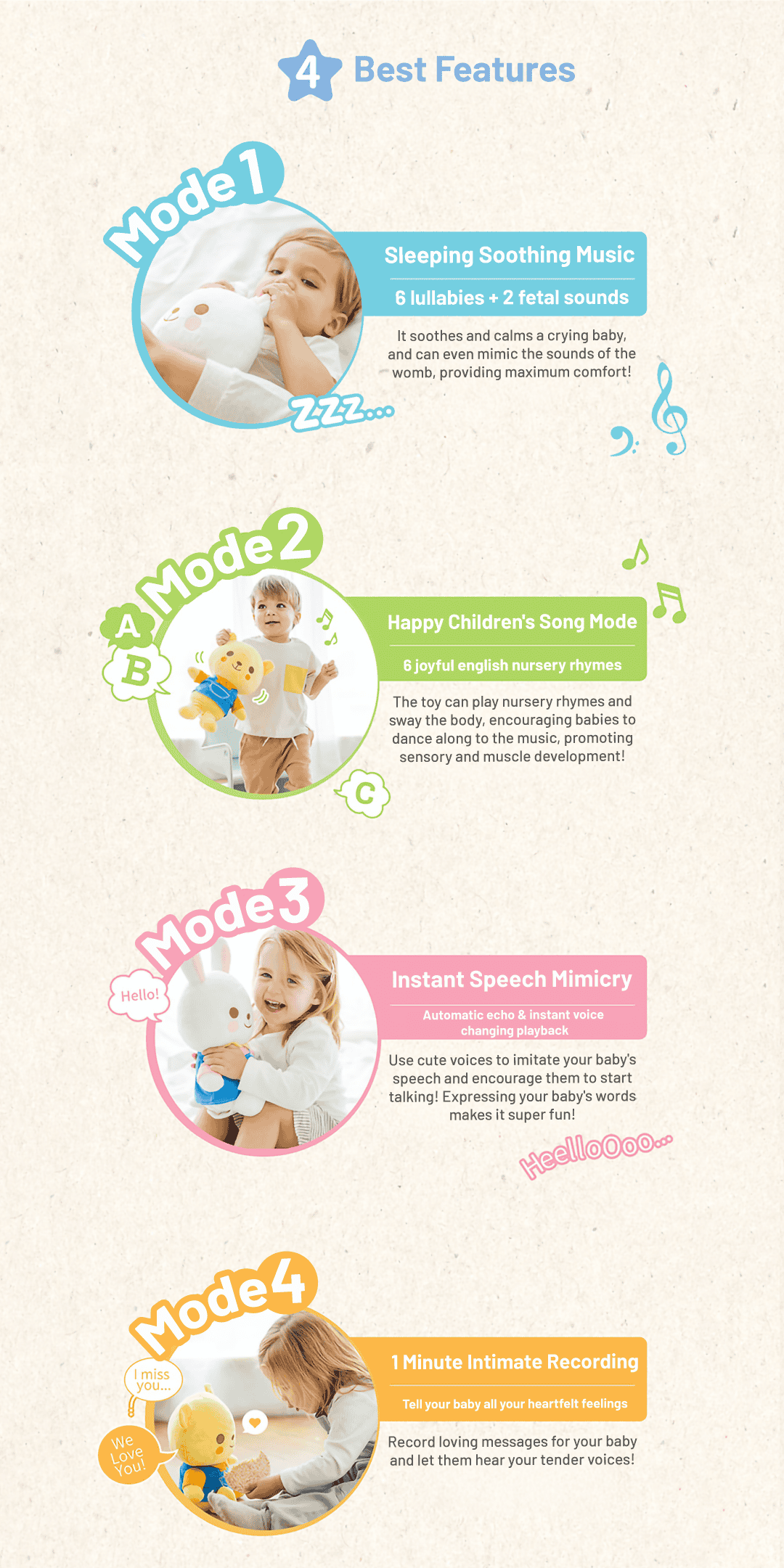 ● Allows recording personalized messages, maintaining an emotional connection with your baby and providing a sense of security.