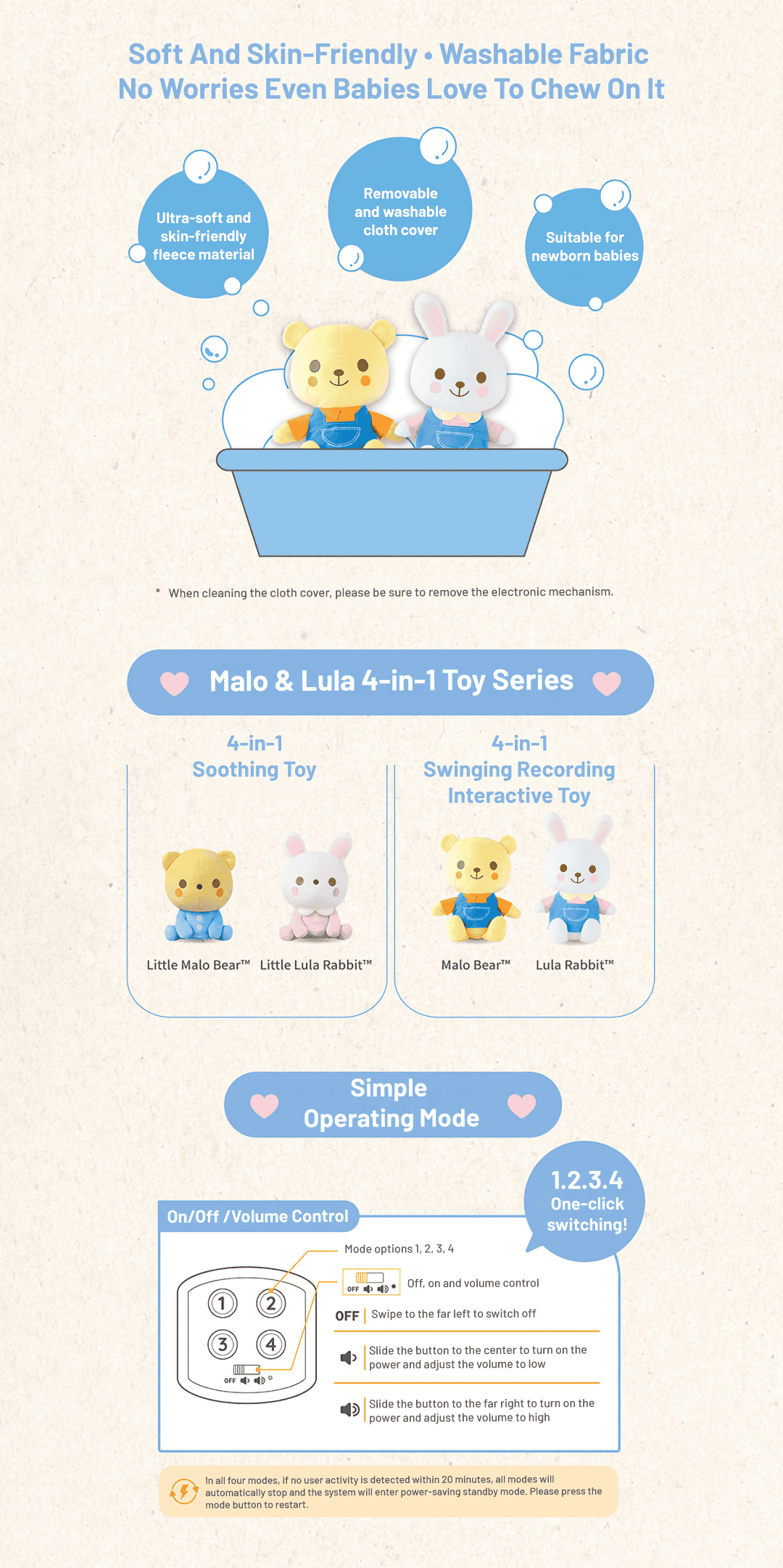 ● A four-in-one rocking interactive recording toy made primarily of soft fabric, featuring a fun electronic mechanism.