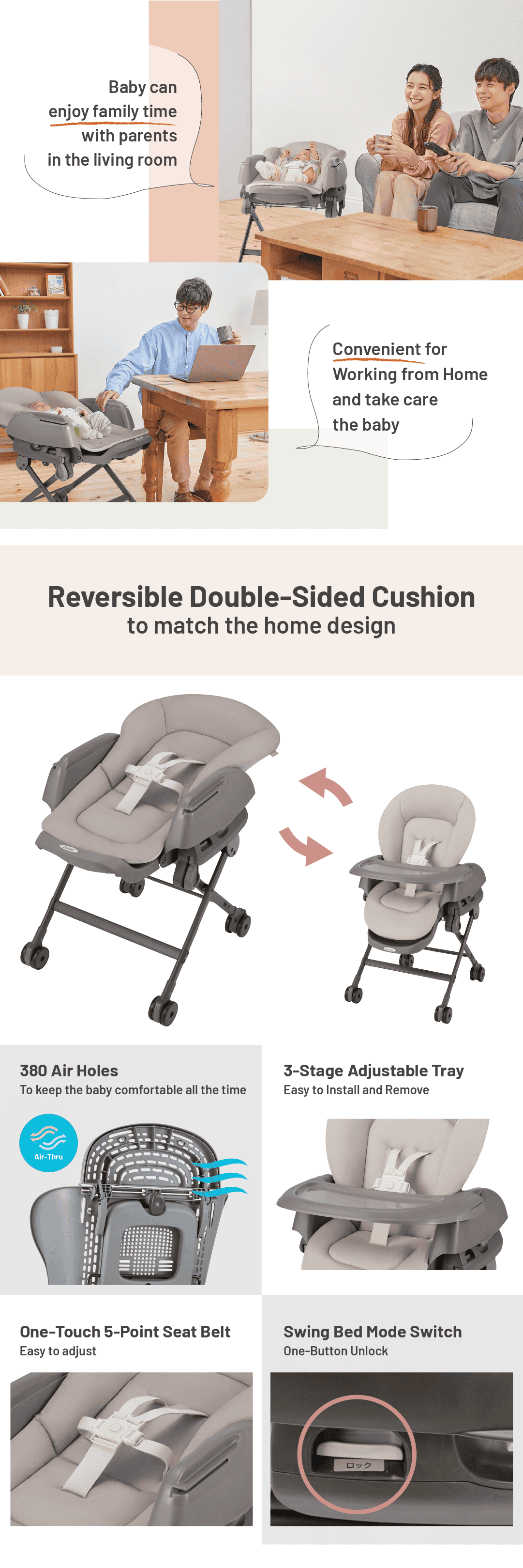 7. 3 levels adjustable tray fits baby’s growth.